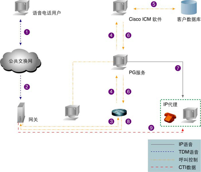 CallManager。(4)Cisco CallManager通過ICM PG把該路由申請送到ICM。(5)ICM檢查客戶的賬號信息,并通過對賬號信息的分析確定路由。(6)ICM調(diào)用一個客戶定義的路由腳本,以便選擇最合適的IPCC代理受理客戶的請求,并通過外設網(wǎng)關(PG)轉(zhuǎn)給目標CCM。(7)PG發(fā)送客戶信息數(shù)據(jù)到目標IPCC代理的桌面(在屏幕上彈出信息框)。(8)CCM指示VoIP網(wǎng)關連接客戶和目標代理。(9)VoIP網(wǎng)關建立語音連接。