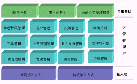 SP統(tǒng)一管理系統(tǒng)從功能邏輯上劃分,我們歸納為三大功能層來對(duì)系統(tǒng)進(jìn)行總體的介紹:接入層、運(yùn)營管理層、自服務(wù)層。如下圖所示: