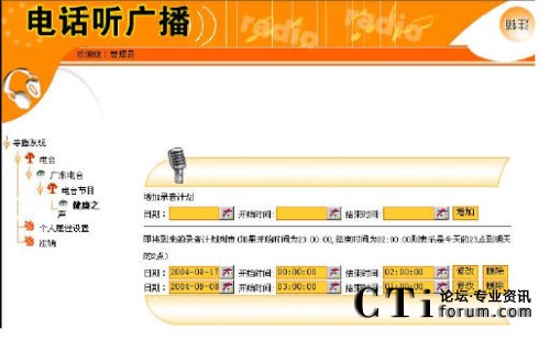 定制自動聽廣播的目的是:用戶設(shè)定的時間到達時,由系統(tǒng)主動呼叫用戶所定制的電話,用戶摘機即可收聽到所定制的廣播節(jié)目內(nèi)容。用戶要獲取該自動服務(wù)的前提是,必須預(yù)先定制好外呼時間、外呼電話和廣播內(nèi)容。