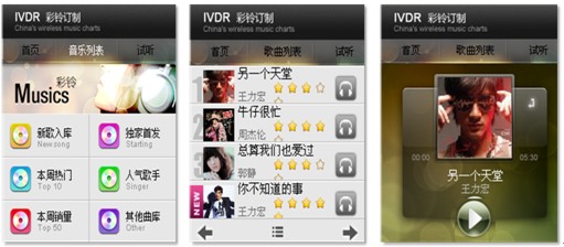 6)彩鈴定制業(yè)務(wù)。傳統(tǒng)彩鈴定制業(yè)務(wù)基于純語音IVR的環(huán)境下使用起來非常繁瑣,進(jìn)行彩鈴檢索比較麻煩,選擇的準(zhǔn)確度也很低。手機(jī)客戶端軟件的應(yīng)用,提供了可視化的交互方式,讓業(yè)務(wù)使用起來直觀便捷很多。用戶通過聲動魅力完成彩鈴信息的瀏覽、試聽、定制過程,用戶可以邊瀏歌曲的同時邊聽到語音對歌曲的介紹,并可試用該歌曲。下圖即為彩鈴定制業(yè)務(wù)操作界面: