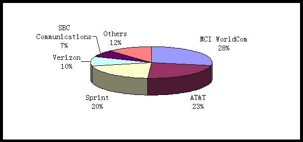 2000年, 美國(guó)寬帶互動(dòng)視頻服務(wù)市場(chǎng)中, MCI WorldCom 是最大的贏家,它所占的市場(chǎng)份額約為28%;其次是AT&T 和Sprint,它們的市場(chǎng)份額分別是23%和20%。