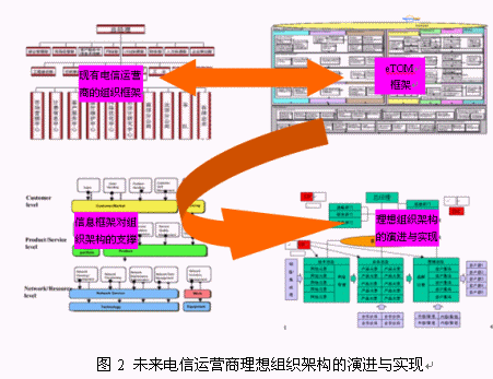 現(xiàn)有的電信運(yùn)營(yíng)商的管理架構(gòu)向理想的管理組織架構(gòu)演進(jìn)過程中,要涉及到不同的中間過程和步驟,對(duì)中間過渡狀態(tài)的評(píng)估和有效實(shí)現(xiàn),是實(shí)現(xiàn)演進(jìn)的關(guān)鍵,F(xiàn)有組織架構(gòu)管理職能的對(duì)應(yīng),業(yè)務(wù)流程的標(biāo)準(zhǔn)化,管理流程的標(biāo)準(zhǔn)化,企業(yè)IT支撐架構(gòu)對(duì)業(yè)務(wù)職能部門的支撐,這些環(huán)節(jié)都是運(yùn)營(yíng)商應(yīng)該重點(diǎn)考慮的中間內(nèi)容。圖2顯示了未來電信運(yùn)營(yíng)商理想組織架構(gòu)的演進(jìn)與實(shí)現(xiàn)過程。其中的任何一個(gè)環(huán)節(jié)都是電信運(yùn)營(yíng)管理研究的核心課題,也直接影響到了電信運(yùn)營(yíng)管理變革的成敗。