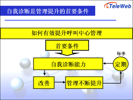 在如何提升呼叫中心運營管理中,自我診斷是首要步驟。通過對現(xiàn)有管理流程的診斷,找出需要改進的項目以及空間,從而評估與呼叫中心整體營運目標(biāo)是否相符。同時透過與整體組織架構(gòu),同業(yè)比較以及標(biāo)準(zhǔn)基準(zhǔn),即可找出需要改進的地方。