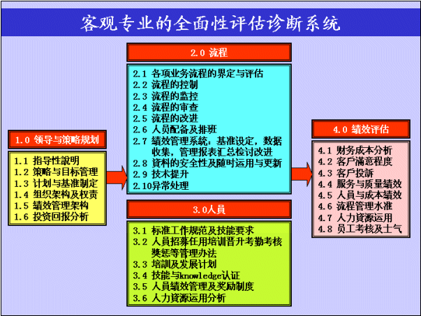 此評估診斷系統(tǒng)以1.0領(lǐng)導(dǎo)與決策規(guī)劃為起始點,作為建立一個以客戶為核心的高質(zhì)量客戶服務(wù)中心的推動根源,并且制定了一個良好的4.0績效評估系統(tǒng),以確保經(jīng)營目標(biāo)與標(biāo)準(zhǔn)質(zhì)量基準(zhǔn)能確實達(dá)成,此過程需透過嚴(yán)謹(jǐn)?shù)牧鞒淘O(shè)計和高效的人員管理去執(zhí)行這套運營體系。