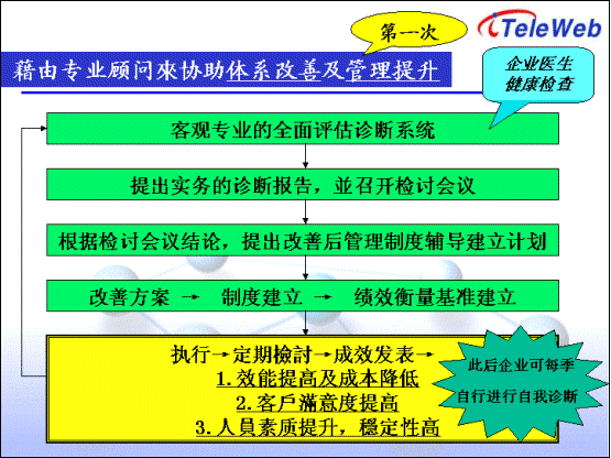 2) PDCA的流程,即診斷、改善計劃、執(zhí)行、檢討以及改善行動方案等。