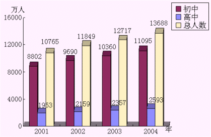 2001年,中國大陸中學(xué)學(xué)生人數(shù)已達10765萬人,而且學(xué)生人數(shù)還在快速增長。初中學(xué)生人數(shù)以每年6.5%的速度增長,普通高中學(xué)生人數(shù)也以每年10%-11%的速度增長?梢钥闯觯逃袌鼍薮蟮臐摿蜕虣C。