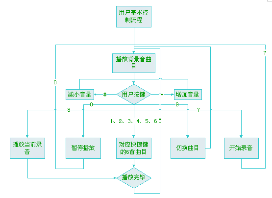 用戶設(shè)定:用戶可以通過語音自動(dòng)導(dǎo)航或者通過上網(wǎng)來自主選擇并設(shè)定背景音效,并把其中最常用的六種音效對應(yīng)1~6號(hào)按鍵,這樣用戶在自己使用的過程中就可以根據(jù)當(dāng)時(shí)的情況使用自己喜歡的背景音效了。