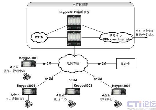 電信運(yùn)營商在核心機(jī)房部署由東進(jìn)Keygoe系列多媒體交換機(jī)組成的高性能集群交換機(jī)系統(tǒng),各個企業(yè)以及各企業(yè)的市內(nèi)分支機(jī)構(gòu)(如管理中心、連鎖門店、配送中心、呼叫中心等)分別配置東進(jìn)Keygoe系列多媒體交換機(jī),并通過電信運(yùn)營企業(yè)的2M專線(E1中繼)方式上聯(lián)到電信運(yùn)營商核心機(jī)房的交換機(jī)集群系統(tǒng),組成一個以集群交換機(jī)系統(tǒng)為核心的星形網(wǎng)絡(luò)(如上圖所示)。所有的市話呼入和呼出都通過核心節(jié)點(diǎn)和電信運(yùn)營商的中繼通道,為連鎖型商業(yè)企業(yè)提供內(nèi)部話音通訊的統(tǒng)一編號、統(tǒng)一撥號、統(tǒng)一維護(hù)和管理,企業(yè)對外公布統(tǒng)一和便于記憶的號碼,實(shí)現(xiàn)企業(yè)管理、營銷和客戶服務(wù)的統(tǒng)一化和規(guī)范化。核心機(jī)房的高性能集群交換機(jī)系統(tǒng)充分考慮冗余備份,如模塊和整機(jī)設(shè)備的雙冗余,從而提高整個通信平臺的高可用性和高可靠性。各個分支的多媒體交換機(jī)具備本地的獨(dú)立工作能力,即使在中繼線路出現(xiàn)故障的情況下,也能正常的工作。同時,Keygoe系列多媒體交換機(jī)集成了7號信令、會議、傳真、語音等豐富的多媒體處理資源,可以為用戶開發(fā)靈活多樣的智能業(yè)務(wù)和增值業(yè)務(wù),豐富了系統(tǒng)的應(yīng)用。
