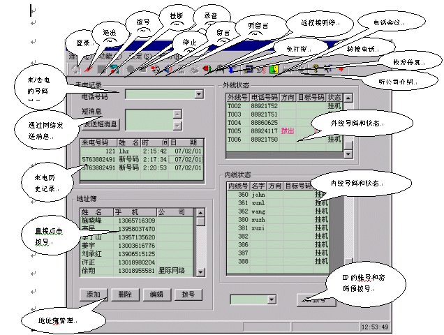 電話(huà)控制臺(tái)(軟電話(huà)),所有系統(tǒng)操作包括電話(huà)、查詢(xún)、短消息等等都可以通過(guò)鍵盤(pán)、鼠標(biāo)操作完成: