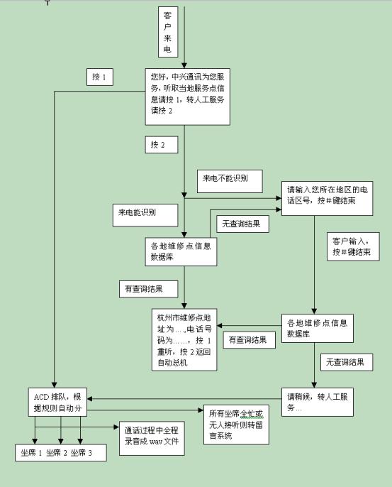 在中興通訊呼叫中心流程設(shè)計(jì)上充分體現(xiàn)了CTI技術(shù)以及數(shù)據(jù)庫(kù)技術(shù)等IT技術(shù)與星際先進(jìn)的管理理念的融合。該流程的設(shè)計(jì)保證將主動(dòng)提高服務(wù)品質(zhì)的工作集中于對(duì)呼叫者最重要的環(huán)節(jié)――對(duì)維修網(wǎng)點(diǎn)信息的咨詢(xún)上。它為所有呼叫者提供了詳細(xì)、精煉、基本的高品質(zhì)電話(huà)服務(wù),同時(shí)又根據(jù)電話(huà)區(qū)號(hào)提供了有針對(duì)性的咨詢(xún)服務(wù)。
