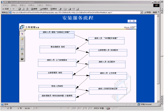 工作流程是指企業(yè)或公司的某種工作按照特定規(guī)范的流程在計(jì)算機(jī)上實(shí)現(xiàn)流轉(zhuǎn)的過程,工作流程由步驟、行為、行為處理、崗位的設(shè)置、權(quán)限設(shè)置等基本元素組成,主要對(duì)維修和回訪的流程進(jìn)行管理。
