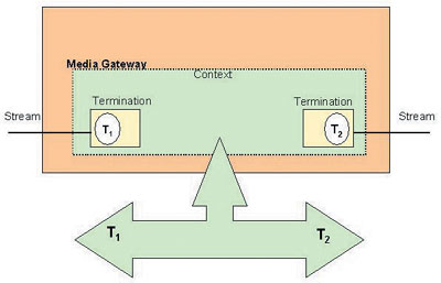 H.248工作在主從模式,并定義了連接模型(參見(jiàn)圖2)。連接模型中有終端、流以及上下文。終端是出/入分組網(wǎng)絡(luò)的媒體流的連接,它允許信號(hào)應(yīng)用到媒體流上,如發(fā)送忙音; 也允許從媒體流中接受發(fā)生的事件,如收到DTMF信號(hào)。上下文則是將終端上媒體流混合并橋接在一起,并描述媒體流之間的關(guān)系。