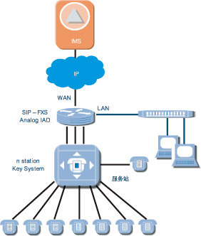 適用于支持模擬線的小交換機,經SIPIAD設備將模擬線路轉換為基于IP的SIP信令流和媒體流,接入IMS系統。經愛立信測試認證過的IAD產品有Mediatrix、Audiocodes、Linksys等。