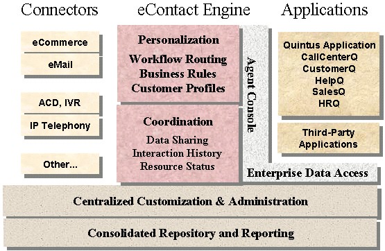 在CRM的實施中,有很多決定實施成敗的關鍵因素,其中之一就是CRM解決方案。目前,市場上的CRM產(chǎn)品林林總總,如國外的Siebel、SAP、Oracle、Clarify、Vantive,國內創(chuàng)智的PowerCRM、用友的NC/CRM、聯(lián)成互動的MyCRM、中圣的SellWell、TurboCRM等,各有自身的特色和優(yōu)勢。本文將從CRM理念的角度介紹另一款CRM解決方案——Quintus eContact Suit(簡稱QeS)解決方案,以供用戶甄選。