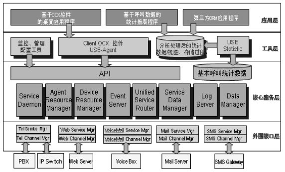 青牛USE從體系結(jié)構(gòu)上分為四個層次。第一層為外圍接口層,負責接入、抽象和發(fā)布來自不同渠道的服務請求;第二層是核心服務層,它是青牛USE軟件的核心部分,對來自不同渠道的服務請求和服務回復進行統(tǒng)一的服務排隊管理、資源調(diào)度管理、日志數(shù)據(jù)管理等,屏蔽了不同渠道的物理特性,真正實現(xiàn)統(tǒng)一路由、統(tǒng)一管理;第三層是工具層,是青牛USE提供給應用開發(fā)商和集成商的開發(fā)接口和配置工具;第四層,USE產(chǎn)品的應用層,為呼叫中心應提供應用功能,比如:呼叫統(tǒng)計分析、呼叫監(jiān)控等。