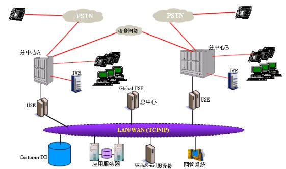 如圖所示,分布式應用模式下,各分支節(jié)點的USE負責本地的呼叫控制和分配,Global USE負責呼叫在不同分支點之間的互專和數(shù)據(jù)控制。