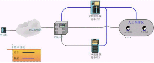上圖是客服中心較常見的結(jié)構(gòu)圖,相當(dāng)于將初級(jí)客服的CT-Server服務(wù)器一分為三。原來(lái)的語(yǔ)音板卡由現(xiàn)在真正的PBX替代,青牛USE和青牛ATS則是從CT-Server軟件包中獨(dú)立出來(lái),強(qiáng)化各自的核心功能,運(yùn)行在兩臺(tái)單獨(dú)的服務(wù)器上(IVR服務(wù)器還是需要語(yǔ)音板卡來(lái)處理話路,但語(yǔ)音板卡已經(jīng)不負(fù)責(zé)PBX的交換功能了)。這種類型的客服中心可以給客戶更大規(guī)模的、更穩(wěn)定的服務(wù),并且撥入電話的客戶感覺(jué)不到系統(tǒng)的變化。
