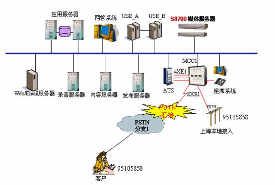 1、采用AVAYA的S8700作為排隊(duì)系統(tǒng),MCC1作為媒體網(wǎng)關(guān),全國280多個(gè)城市的客戶撥打本地電話通過電信網(wǎng)絡(luò)匯接到上海中心;