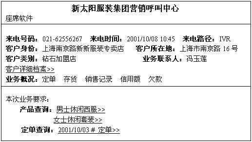 呼叫中心是以CTI技術(shù)為根本的,它的長項就在于能把計算機系統(tǒng)與電話系統(tǒng)集成起來。在呼叫中心所集成的計算機系統(tǒng)中,除了呼叫中心本身的應用軟件外,更重要的就是與ERP(企業(yè)資源計劃)系統(tǒng)集成后產(chǎn)生的功能強大的座席端應用軟件。實際上,與ERP系統(tǒng)無縫連接的座席端應用軟件,很容易就能擴充為一個簡單的CRM(客戶關系管理)系統(tǒng)。這時,呼叫中心就真正成了服裝生產(chǎn)商整個運營管理體系中的溝通樞紐和響應中心。