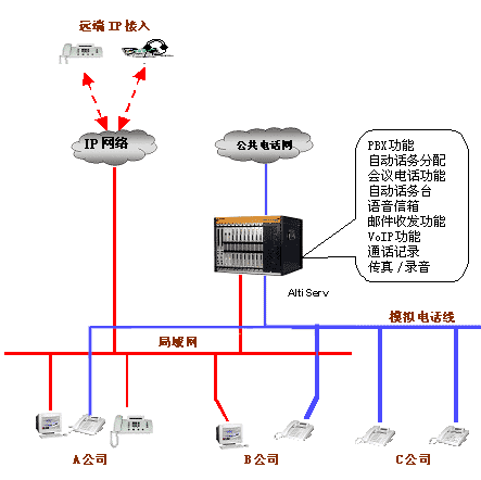 | 多個小型辦公室共享一個電話系統(tǒng)或局域網(wǎng)是一個比較經(jīng)濟(jì)選擇,現(xiàn)在很多辦公樓也是采用這種方式為大樓里的辦公室提供通訊或數(shù)據(jù)服務(wù),大大減少了租戶的通訊的投資。但是采用傳統(tǒng)的交換機(jī)也帶來很多不便。如只能有一個總機(jī),撥入的電話不知道是找哪個公司的,既增加接線員的工作,又不利樹立公司的形象。如何公平地向共用交換機(jī)的辦公室的收取電話費(fèi)也是個解決不了的問題,因?yàn)闊o法記錄和統(tǒng)計每個辦公室的撥出的電話量。 但是采用奧迪堅的ALTISERV,這些問題很自然地就解決了。將每個辦公室設(shè)成一個工作組,每個工作組可以設(shè)置特定的撥入撥出電話市話號碼,對總機(jī)而言,來電時的桌面顯示公司名,或者通過多個自動話務(wù)臺直接轉(zhuǎn)入工作組。 對于撥出電話,只能通過事先設(shè)定電話進(jìn)入市話網(wǎng)。這樣,這個電話的全部費(fèi)用都由這個公司。 此外,共享的辦公室及其員工都可以使用ALTISERV提供的全部功能,就好象這個辦公室建了一個專門的網(wǎng)絡(luò)電話系統(tǒng)一樣。 接線圖如下: |