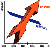 "2005年IP-PBX的使用線數(shù)將超過傳統(tǒng)PBX。從2001年開始傳統(tǒng)PBX以每年12%的速度在下降,IP-PBX以每年30%的速度增長(zhǎng)"。