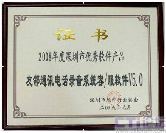 2009年1月,友鄰通訊電話錄音系統(tǒng)客/服軟件V5.0 榮獲由深圳市軟件行業(yè)協(xié)會頒發(fā)的“2008年度深圳市優(yōu)秀軟件產品”榮譽證書!2008年度深圳市優(yōu)秀軟件產品”的評選是深圳市軟件行業(yè)協(xié)會在全市范圍內舉辦的軟件產品推優(yōu)活動,經過了企業(yè)申報、技術資料審核、專家評審等等幾大嚴格篩選程序。
