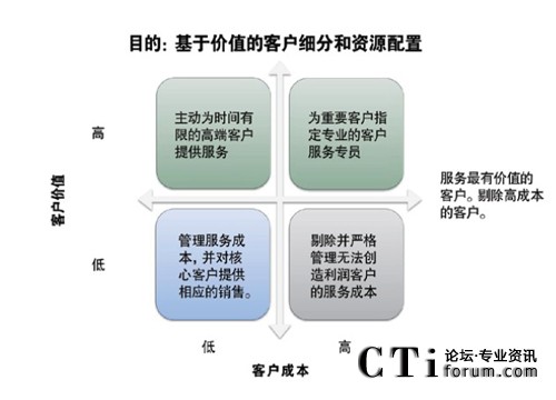 現(xiàn)實(shí)情況是,許多采取該策略的公司都僅將基于價(jià)值的客戶細(xì)分應(yīng)用于高價(jià)值、高成本的客戶,而不是應(yīng)用于已有客戶的絕大部分。這是一種不可持續(xù)的商業(yè)行為。然而,許多公司之所以這樣做,是因?yàn)楣驹谒械目蛻艏?xì)分領(lǐng)域,無視價(jià)值高低,不加區(qū)分的投入成本和服務(wù),會(huì)存在風(fēng)險(xiǎn),即讓服務(wù)更多的投入到價(jià)值不高,卻又經(jīng)常呼入的客戶上,從而忽視了一些更有
