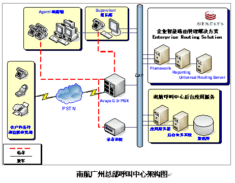 eSOON & Genesys為南航提供的解決方案包括:Genesys 平臺(tái)架構(gòu)(Framework),以及ERS企業(yè)智能路由解決方案(Enterprise Routing Solution)。建成以廣州為中心,全國分布而集中式接近200坐席的呼叫中心,并于本年開始進(jìn)行語音/數(shù)據(jù)聯(lián)網(wǎng)。