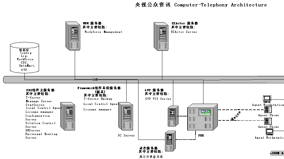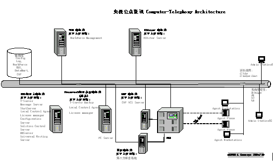 改建后的CCTV公眾資訊中心系統(tǒng),配置了帶冗余備份的Genesys Framework基本平臺(tái)及ERS企業(yè)路由解決方案、WFM人力資源管理解決方案、GVP自動(dòng)語(yǔ)音應(yīng)答解決方案和EZactor呼叫中心CRM平臺(tái)。