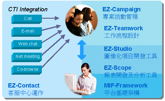 EZactor客服中心CRM平臺(tái)系統(tǒng),以MIF-Framework模塊為平臺(tái)基礎(chǔ)架構(gòu),在該強(qiáng)大之穩(wěn)定架構(gòu)上以EZ-Contact模塊作為客服中心運(yùn)作核心,另外延伸有EZ-Campaign、EZ-Teamwork、EZ-Scope、EZ-Studio等模塊,分別提供營(yíng)銷活動(dòng)管理、工作流程設(shè)計(jì)、數(shù)據(jù)統(tǒng)計(jì)與分析、項(xiàng)目開(kāi)發(fā)工具等功能,全面滿足客服中心運(yùn)行之需要。