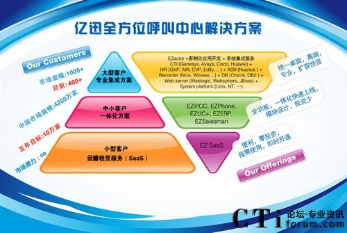 Service Software”;而“易之愛(ài)彼喜喜”及“易之風(fēng)”產(chǎn)品,顧名思義,就是億迅推出基于CESS理念的呼叫中心產(chǎn)品EZIPCC及EZPhone的中文注釋?zhuān)驗(yàn)楹?jiǎn)單容易,讓客戶更喜歡;“CHANGE”不僅代表了億迅發(fā)展的這11年一直秉持創(chuàng)新與改革的經(jīng)驗(yàn)哲學(xué),也代表了億迅自主研發(fā)的核心CRM產(chǎn)品“EZactor”在高端市場(chǎng)與主流戰(zhàn)略合作伙伴的關(guān)系,其中的“C”,是指CISCO;“H”指Huawei;“A”指“AVAYA”;“N”指Nuance;“G”指Genesys;而最后的“E”,則代表了eSOON。