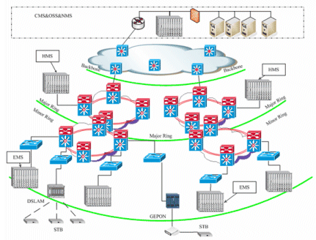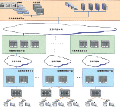 奔流(RollingStream)系統(tǒng)可以支持百萬(wàn)級(jí)別的用戶規(guī)模,支持3級(jí)和多級(jí)部署架構(gòu)。包括中心節(jié)點(diǎn)(CMS)、區(qū)域匯聚節(jié)點(diǎn)(HMS)以及邊緣服務(wù)節(jié)點(diǎn)(EMS)。奔流(RollingStream)系統(tǒng)對(duì)于寬帶IP網(wǎng)絡(luò)的容忍度是很高的,可以支持各種網(wǎng)絡(luò)承載形式,也可支持各種接入方式。如LAN接入、DSLAM接入、GEPON接入。對(duì)于IPTV系統(tǒng),可建設(shè)專網(wǎng),CMS和HMS、EMS直接相連,也可以旁掛在城域網(wǎng)上。另外,無(wú)論P(yáng)PPoE還是DHCP上網(wǎng)方式都可以支持。
