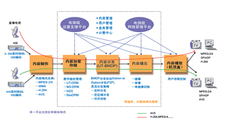 奔流(RollingStream)系統(tǒng)為IPTV業(yè)務(wù)提供了端到端的業(yè)務(wù)解決方案,先進(jìn)的系統(tǒng)架構(gòu)對(duì)Codec完全透明,可透明支持AVS,如下圖。奔流(RollingStream)系統(tǒng)包括內(nèi)容制作、內(nèi)容存儲(chǔ)/加密、內(nèi)容分發(fā)、內(nèi)容播放、終端顯示的各個(gè)方面,都可提供基于電信級(jí)的解決方案。