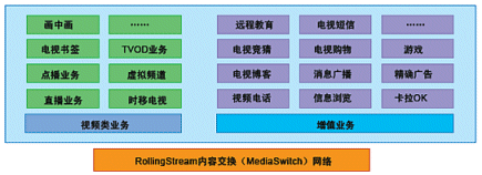 奔流(RollingStream)系統(tǒng)不僅僅支持以LiveTV、Timeshift-TV、VOD、TVOD等為基礎(chǔ)的各項(xiàng)功能,而且具有良好的功能上的可擴(kuò)展性,在此平臺(tái)上可以支持眾多豐富多彩的增值互動(dòng)業(yè)務(wù);诒剂(RollingStream)具有無(wú)限的業(yè)務(wù)增長(zhǎng)空間,如下圖所示意: