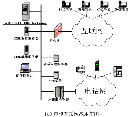 穎科VoiceXML技術成功應用于遼寧電信168聲訊互聯(lián)網(wǎng)系統(tǒng),也是VoiceXML技術在國內(nèi)首次成功實現(xiàn)電信級應用。在原有的聲訊平臺上,通過新添加的穎科VXML系統(tǒng),可以充分利用VoiceXML的優(yōu)勢,實現(xiàn)增值業(yè)務快速得開發(fā)、部署、和更改,借助IXG工具,能夠快速得開發(fā)出互聯(lián)網(wǎng)聲訊業(yè)務。
