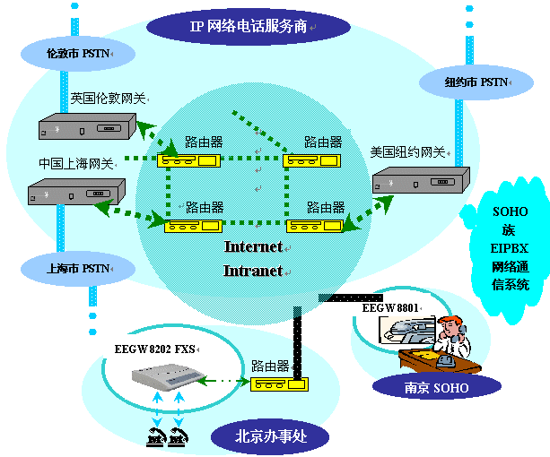 目前,在全球各地蓬勃發(fā)展起一項新興行業(yè)——IP網(wǎng)絡(luò)電話服務(wù)商,他們利用遍布全球、資源豐富的Internet / Intranet網(wǎng)絡(luò),組織自己的IP電話核心網(wǎng)絡(luò),將該網(wǎng)絡(luò)的服務(wù)開放給各地的公眾。其核心網(wǎng)絡(luò)的網(wǎng)關(guān)完全遵照ITU-T H.323標(biāo)準(zhǔn),可以解決電話號碼與IP地址的映射,IP地址解析,路由尋路等問題。能夠?qū)崿F(xiàn)SOHO族通過該網(wǎng)絡(luò)接入全球各地的市話。