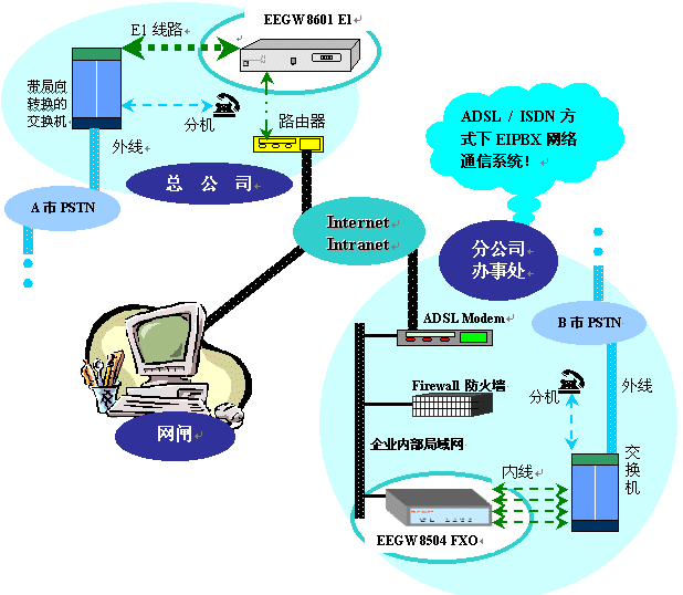 為實現(xiàn)地理位置分散的各企業(yè)分支機(jī)構(gòu)間的語音通信,節(jié)約企業(yè)內(nèi)部的通信成本和管理成本,許多公司在選擇ADSL或ISDN等其他寬帶接入技術(shù)接入Internet,同時希望利用該網(wǎng)絡(luò)建立內(nèi)部的EIPBX網(wǎng)絡(luò)通信系統(tǒng)。