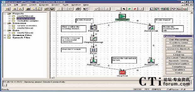 呼叫中心測試的第一步就是要創(chuàng)建要被測試的業(yè)務(wù)的呼叫流程圖?梢酝ㄟ^一個含有標準呼叫流程圖標庫的呼叫流程圖形編輯器創(chuàng)建呼叫流程圖。每個呼叫流程的圖標都包含一段Hammer