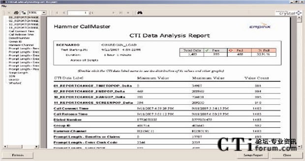 如果響應(yīng)時間超過設(shè)定的預置值(閥值),或者發(fā)現(xiàn)任何其它問題時,Hammer可以把這個錯誤和它的位置記錄在數(shù)據(jù)庫中,然后實時顯示測試結(jié)果。Hammer可以模擬呼叫流程中的任何一個方面,包括DTMF按鍵音可變信息的記錄或者是為測試支持語音識別系統(tǒng)而播放大量的語音文件。Hammer專利的語音提示識別能力更可以自動檢驗在IVR和ACD/PBX系統(tǒng)中是否正確播放語音提示。