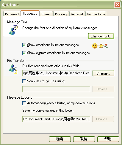 Messenger 6.0必須在個人選項中進(jìn)行設(shè)置后才可以自動保存聊天記錄,默認(rèn)是不支持的。