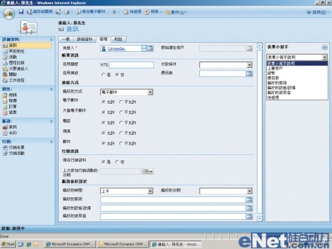 Dynamics CRM 4.0的聯(lián)絡(luò)人,除了基本信息之外,還可以針對偏好的聯(lián)絡(luò)方式、活動記錄、次要聯(lián)絡(luò)人或者商機(jī)管理等,儲存更詳細(xì)的記錄。