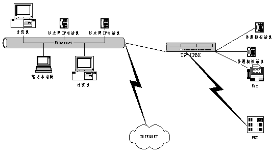 在一個(gè)有很多分支機(jī)構(gòu)的大企業(yè)的分部安裝Tw-IPBX ,通過IP 網(wǎng)絡(luò)與企業(yè)總部PBX 連接后后,可實(shí)現(xiàn)多種應(yīng)用,同時(shí)降低了成本。在這種應(yīng)用場(chǎng)景中,采用了基于IP 的傳輸機(jī)制(VoIP)。此種情況下VoIP的美好之處在于語(yǔ)音和數(shù)據(jù)的IP 傳輸管路需求(根據(jù)呼叫)的無(wú)縫可伸縮性,而無(wú)需任何靜態(tài)的分區(qū),這種解決方案可提供性能價(jià)格比極高且靈活的網(wǎng)絡(luò)運(yùn)作。