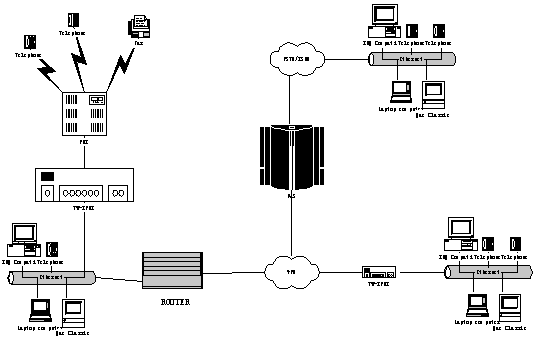 該應(yīng)用示意圖具有一個(gè)(iPBX )或多個(gè)辦公場(chǎng)地(nIPBX - 組網(wǎng)iPBX )提供電話系統(tǒng)解決方案。該解決方案是基于IP 電話技術(shù)而構(gòu)建的Tw-IPBX “一體化概念”,同時(shí)可提供傳統(tǒng)的模擬電話概念,如模擬電話和傳真機(jī)。以下敘述了客戶機(jī)組合的單獨(dú)應(yīng)用場(chǎng)景,包括: