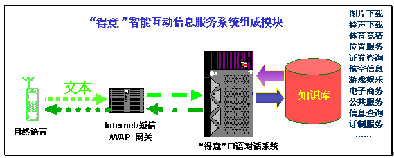 "得意口語對話系統(tǒng)"可以充分滿足互聯(lián)網(wǎng)、短信、WAP等業(yè)務(wù)的智能互動信息服務(wù)需求,為SP和用戶提供了更易用、好用、實(shí)用的信息交流平臺。