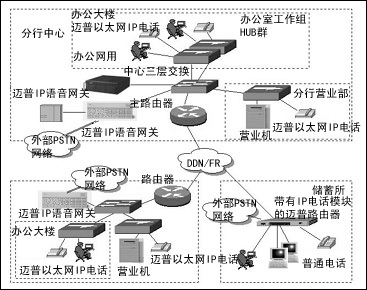 對于分行、支行辦公大樓各辦公室,通過以太網(wǎng)接入到整個網(wǎng)絡(luò),采用邁普豪華型以太網(wǎng)IP電話機(jī)實(shí)現(xiàn);而對于儲蓄所,受資金投入的限制,可以通過經(jīng)濟(jì)型邁普以太網(wǎng)電話機(jī)實(shí)現(xiàn)IP語音接入,亦可使用現(xiàn)有路由器上的IP語音模塊。邁普以太網(wǎng)IP電話機(jī)采用雙以太網(wǎng)口設(shè)計(jì),內(nèi)置了交換芯片,使得PC與以太網(wǎng)電話機(jī)“感覺”上是使用了交換機(jī)的兩個端口,相互之間沒有任何影響。