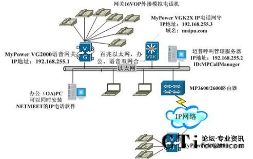 在這種應用中,用戶通過IP網(wǎng)絡接入以太網(wǎng)IP電話機的同時,還可以在MyPower VG2000 IP語音網(wǎng)關上插入兩張16VOP IP電話模塊,接32個普通電話機。這32個電話機就像其它以太網(wǎng)IP電話機一樣可以和其它IP網(wǎng)上的IP電話機互相呼叫,此時,我們把MyPower VG2000 IP語音網(wǎng)關作為一個小型的PBX接入平臺。