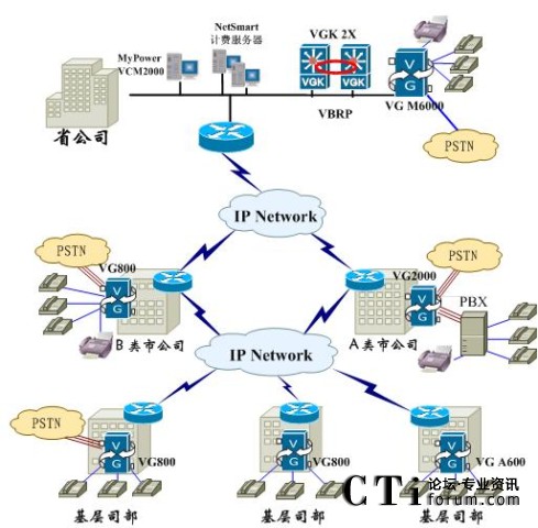 在此典型應用中,省公司采用VG M6000,配置32FXO接入卡和E1中繼卡,實現(xiàn)大容量接入和本地PSTN落地;地市B采用VG800,配置FXO模擬接入卡和FXS模擬中繼卡,實現(xiàn)本地電話接入和PSTN落地;地市A采用VG2000,將PBX電話接入IP電話網(wǎng)絡,并實現(xiàn)本地PSTN落地;基層公司根據(jù)容量需求,分別采用VG800或者VG A600實現(xiàn)電話接入。省公司配置兩臺邁普IP語音網(wǎng)守VGK 2X,運行VBRP協(xié)議,實現(xiàn)網(wǎng)守熱備,充分保證整個網(wǎng)絡的可靠性。