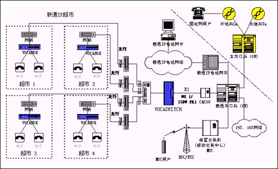 用戶(hù)端使用帶4~8個(gè)模擬端口的VOCABOX實(shí)現(xiàn)語(yǔ)音接入IP數(shù)據(jù)網(wǎng)。在局端采用的是聯(lián)通交換局中大量部署的華為C&C08 交換機(jī)的E1數(shù)字中繼接口資源與VOCASWITCH對(duì)接,并利用光端機(jī)加網(wǎng)橋連接聯(lián)通已有的光纖,實(shí)現(xiàn)聯(lián)通IP超市接入聯(lián)通電話(huà)網(wǎng)絡(luò)。