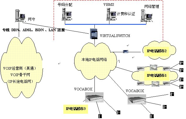 此方案的特點(diǎn)是將電話(huà)終端深入到公用電話(huà)的超市,用戶(hù)可以撥打IP長(zhǎng)途電話(huà)、PSTN普通電話(huà)用戶(hù)及移動(dòng)電話(huà)用戶(hù),并在用戶(hù)端通過(guò)VOCA-BOX語(yǔ)音網(wǎng)關(guān)、計(jì)費(fèi)卡和計(jì)費(fèi)軟件實(shí)現(xiàn)本地營(yíng)業(yè)廳立即計(jì)費(fèi)的要求。在運(yùn)營(yíng)商的管理中心通過(guò)配置VBMS系統(tǒng)實(shí)現(xiàn)后臺(tái)集中計(jì)費(fèi)認(rèn)證功能,用于管理各個(gè)營(yíng)業(yè)中心的VOCA-BOX語(yǔ)音網(wǎng)關(guān),各營(yíng)業(yè)中心的VOCA-BOX語(yǔ)音網(wǎng)關(guān)提供認(rèn)證計(jì)費(fèi)信息給VBMS,計(jì)費(fèi)類(lèi)型可按實(shí)際的需求配置如:預(yù)付費(fèi)、后付費(fèi)等。此方案可以擴(kuò)大ISP及寬帶網(wǎng)絡(luò)運(yùn)營(yíng)商的業(yè)務(wù)市場(chǎng),增加ISP及寬帶網(wǎng)絡(luò)運(yùn)營(yíng)商的收益。