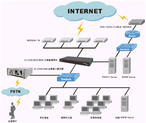 另外,Dr.COM 2033 BMG計(jì)費(fèi)管理網(wǎng)關(guān)本身提供了多種通信線路的接口,支持普通撥號(hào)線、ISDN到專線等各種線路。并集成了包過(guò)濾的防火墻,以及采用NAT地址轉(zhuǎn)換協(xié)議,保證了校園網(wǎng)內(nèi)的安全。